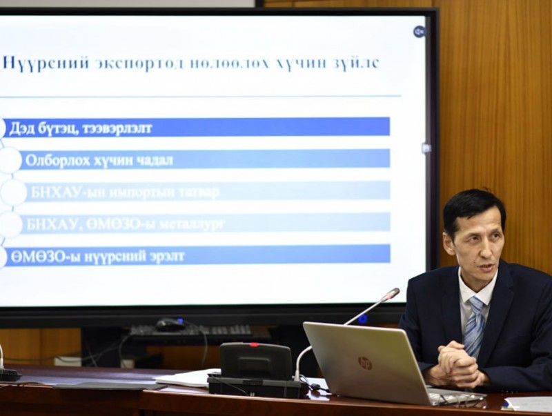 Энэ үеэр Төсвийн тогтвортой байдлын зөвлөлийн дарга Н.Энхбаяр, хууль зүйн үндэслэлд тулгуурлан, эдийн засаг, төсвийн өнөөгийн байдал, макро эдийн засгийн загвар, таамаглал, гадаад, дотоод орчны эрсдэлт хүчин зүйлсэд хийсэн дүн шинжилгээ, судалгааг танилцуулав. Тэрбээр, Монгол Улсын эдийн засаг, төсвийн өнөөгийн төлөв байдлын хүрээнд эдийн засгийн бодит өсөлт, гадаад худалдааны эргэлт, экспортын хэмжээ, өөрчлөлтийг танилцуулж, өнгөрсөн оны байдлаар нийт экспорт 15.2 тэрбум ам.долларт хүрсэн гэдгийг дурдлаа.