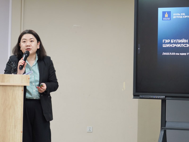 Хэлэлцүүлэгт Хууль зүй, дотоод хэргийн дэд сайд Б.Солонгоо оролцож, 2023 оны 11 дүгээр сарын 03-нд УИХ-д өргөн мэдүүлсэн “Гэр бүлийн тухай хуулийн шинэчилсэн найруулга"-ын төслийг танилцуулав.