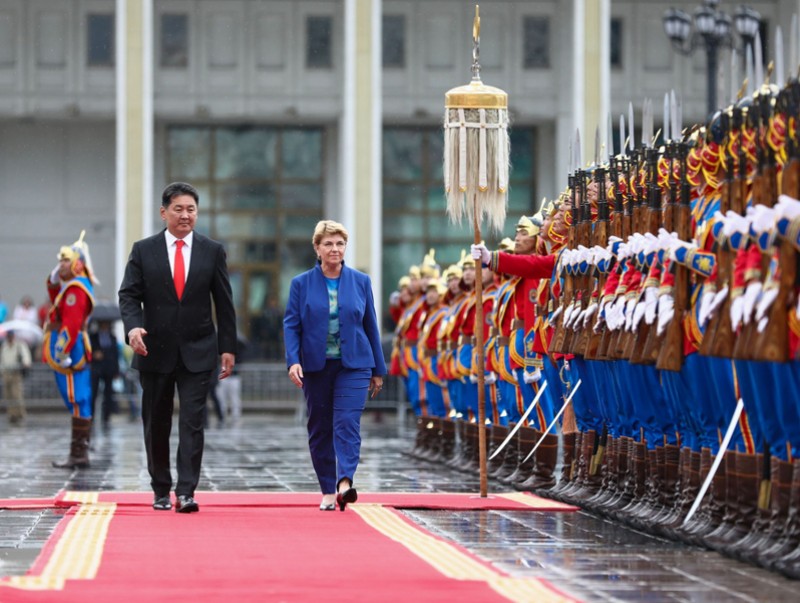 Монгол Улсын Ерөнхийлөгч У.Хүрэлсүх Швейцарын Холбооны Улсын Ерөнхийлөгч Виола Амхердийг Д.Сүхбаатарын талбайд албан ёсоор угтаж авлаа.