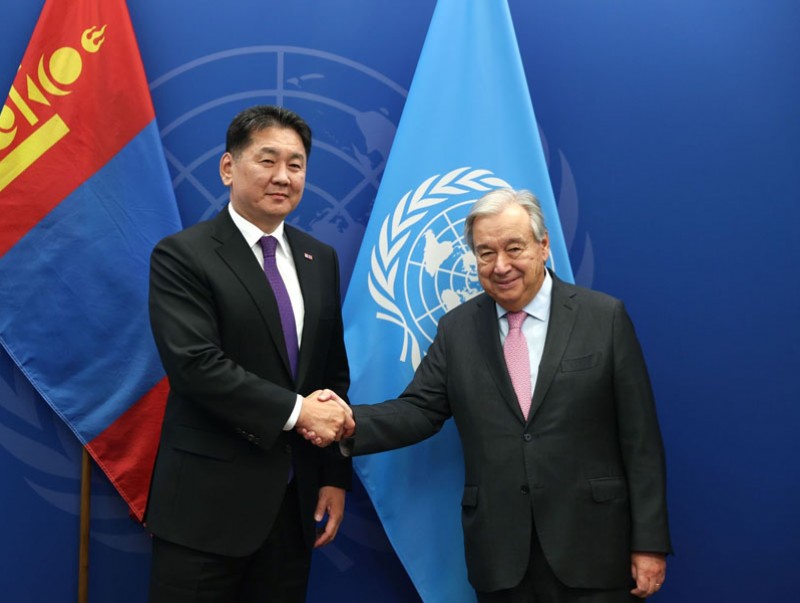 Монгол Улсын Ерөнхийлөгч Ухнаагийн Хүрэлсүх Нью-Йорк хотноо болж буй НҮБ-ын Ерөнхий Ассамблейн 79 дүгээр чуулганы Ерөнхий санал шүүмжлэлд оролцох үеэрээ НҮБ-ын Ерөнхий нарийн бичгийн дарга Антонио Гутеррештэй 2024 оны есдүгээр сарын 25-ны өдөр уулзлаа.