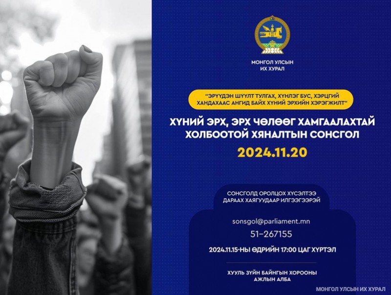 Улсын Их Хурлын Хууль зүйн байнгын хороо 2024 оны 08 дугаар сарын 15-ны өдөр хуралдаж Хүний эрх, эрх чөлөөг хамгаалахтай холбоотой Улсын Их Хурлын хяналтын сонсголыг “Эрүүдэн шүүлт тулгах, хүнлэг бус, хэрцгий хандахаас ангид байх хүний эрхийн хэрэгжилт” сэдвээр 2024 оны 11 дүгээр сарын 20-ны өдөр зохион байгуулахаар тогтлоо.