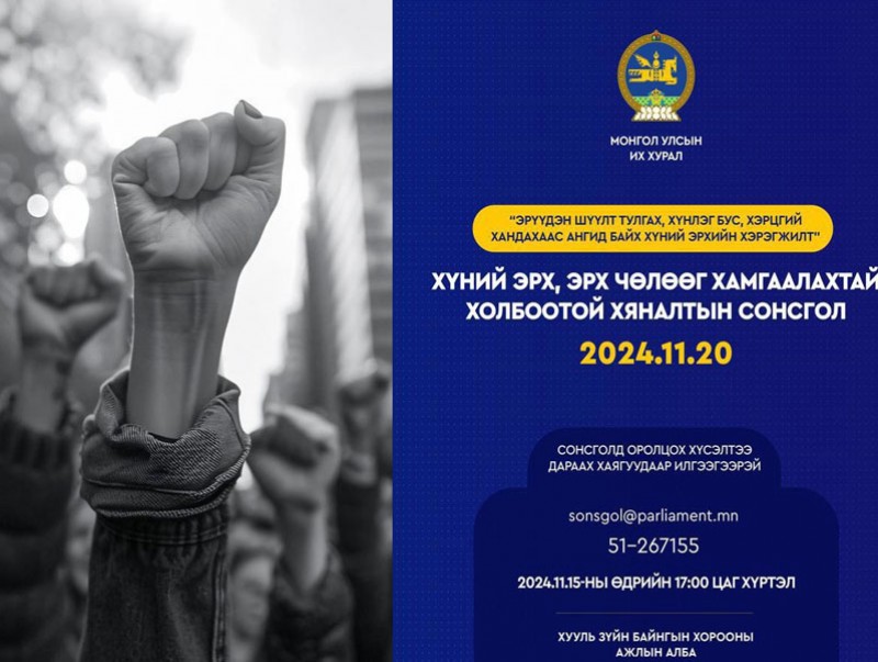 Улсын Их Хурлын Хууль зүйн байнгын хороо 2024 оны 08 дугаар сарын 15-ны өдөр хуралдаж Хүний эрх, эрх чөлөөг хамгаалахтай холбоотой Улсын Их Хурлын хяналтын сонсголыг “Эрүүдэн шүүлт тулгах, хүнлэг бус, хэрцгий хандахаас ангид байх хүний эрхийн хэрэгжилт” сэдвээр 2024 оны 11 дүгээр сарын 20-ны өдөр зохион байгуулахаар тогтлоо.