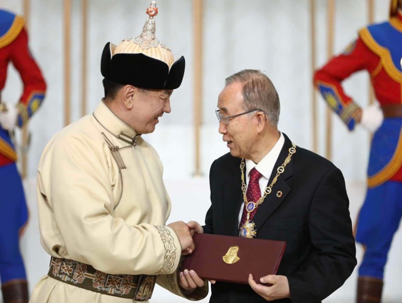Монгол Улсын Ерөнхийлөгч Ухнаагийн Хүрэлсүх зарлиг гарган, Их эзэн Чингис хааны мэндэлсний 862 жилийн ой, “Монгол бахархлын өдөр”-ийг тохиолдуулан НҮБ-ын наймдахь Ерөнхий нарийн бичгийн дарга, “Илүү сайхан ирээдүйн төлөөх Бан Ги Мүн” сангийн тэргүүн Бан Ги Мүн-д төрийн дээд шагнал, “Чингис хаан” тэргүүн зэргийн одон хүртээлээ.