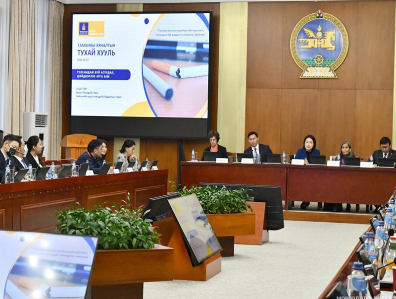 Улсын Их Хурлын даргын 2024 оны 110 дугаар захирамжаар багуулагдсан ажлын хэсгээс Эрүүл мэндийн яам, Дэлхийн Эрүүл мэндийн байгууллагын Монгол дахь төлөөлөгчийн газартай хамтран зохион байгуулсан “Тамхины хяналтын тухай хуулийн хэрэгжилт, тулгамдаж буй асуудал” хэлэлцүүлгийн өнөөдрийн хуралдаанд тамхины хяналтын талаарх олон улсын бодлого, түүний чиг хандлага, өөрчлөлт, туршлагын талаар ярилцлаа.