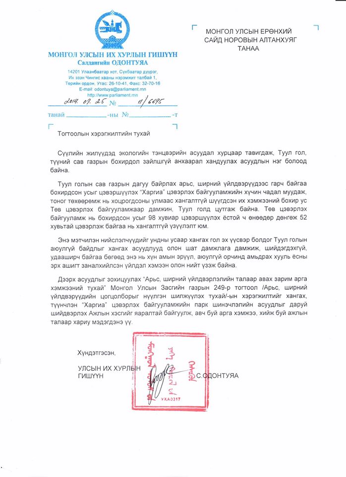 УИХ-ын гишүүн С.Одонтуяа Ерөнхий сайд Н.Алтанхуягт Туул голын бохирдлын асуудлаар яаралтай арга хэмжээ авах талаар шаардлага хүргүүлжээ.