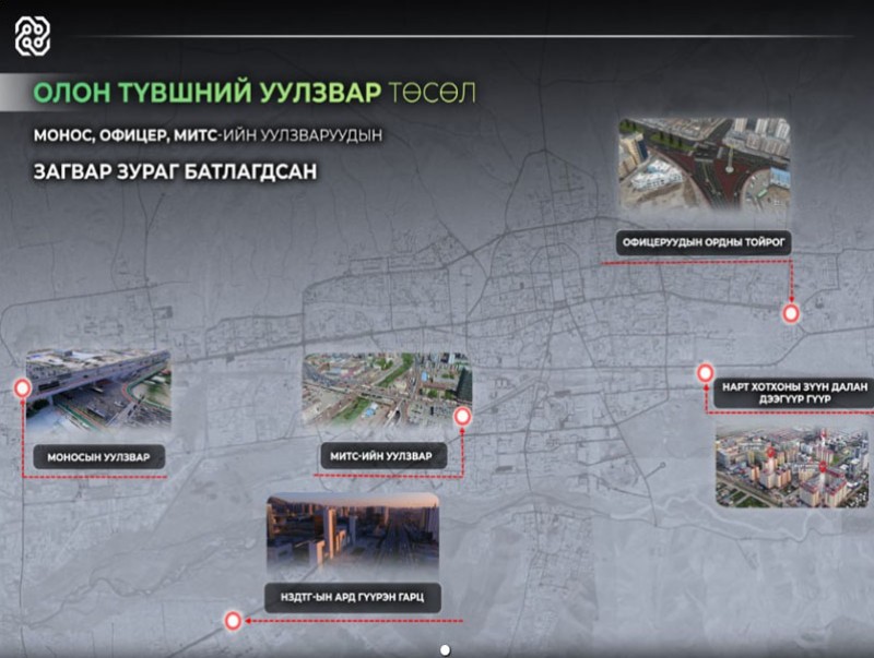 Үүнээс Монос, Офицер, МИТС-ийн уулзваруудын загвар зураг батлагдсан бол өөрчлөгдсөн байршил болох Нарт хотхоны зүүн далангийн гүүрэн байгууламжийн загвар зургийг боловсруулан дуусч зөвшилцөх шатандаа явж байна. Наадамчдын замд явган хүний гүүрэн гарцын загвар зураг боловсруулах ажил үргэлжилж байгаа юм. Мөн инженерийн шугам сүлжээний асуудлыг холбогдох байгууллагууд руу техникийн нөхцөл хүссэн албан бичиг болон холбогдох материалуудыг хүргүүлэн хүлээгдэж байна. Нарийвчилсан зураг төслийн ажил 35%-тай үргэлжилж байгаа аж.