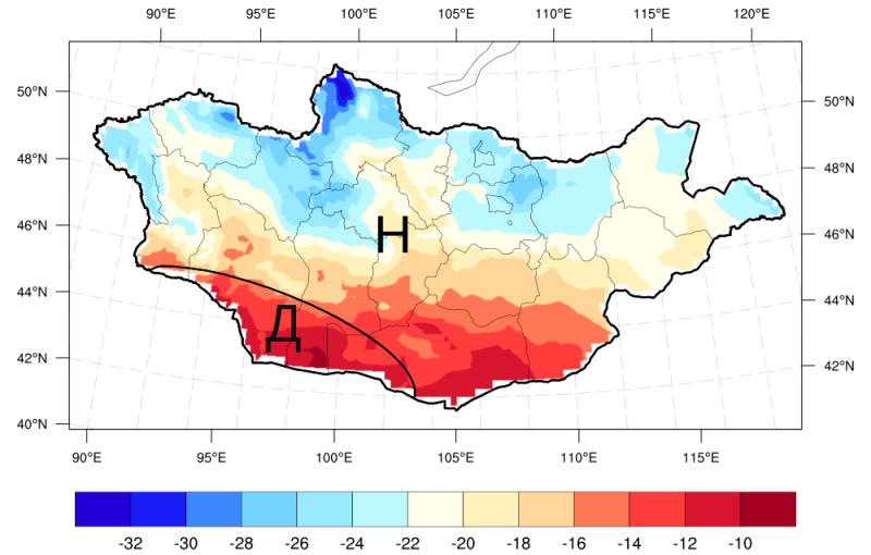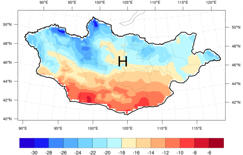 Агаарын дундаж температур 2026 нэгдүгээр сард Говь-Алтай, Баянхонгорын өмнөд, Өмнөговийн баруун хэсгээр ОЖД–аас дулаан, бусад нутгаар дунджийн орчим байх төлөвтэй байна.