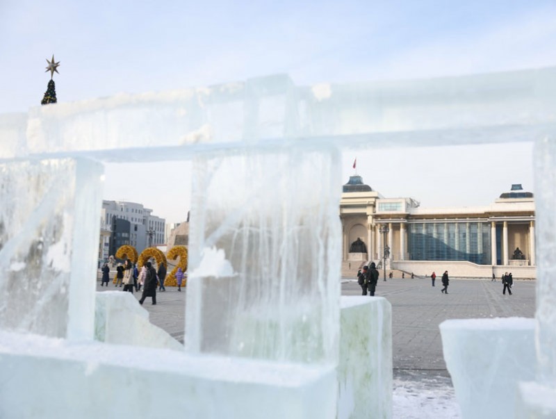 Шинэ жилийн баярыг тохиолдуулан төв талбайд мөсөн хотхон урлаж байна.