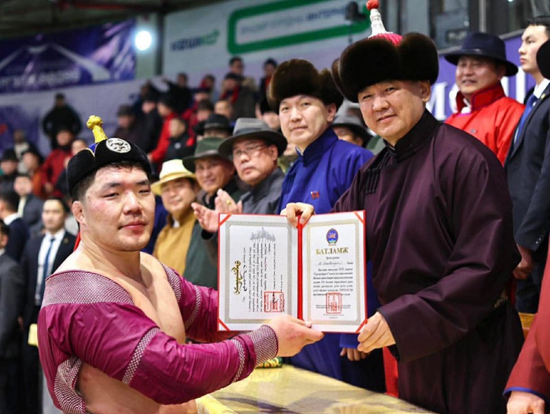Бөхийн барилдааны наймын давааны дараа Монгол Улсын Ерөнхийлөгч Ухнаагийн Хүрэлсүх их шөвгийн дөрвөн бөхөд шагнал гардуулж, баяр хүргэлээ.
