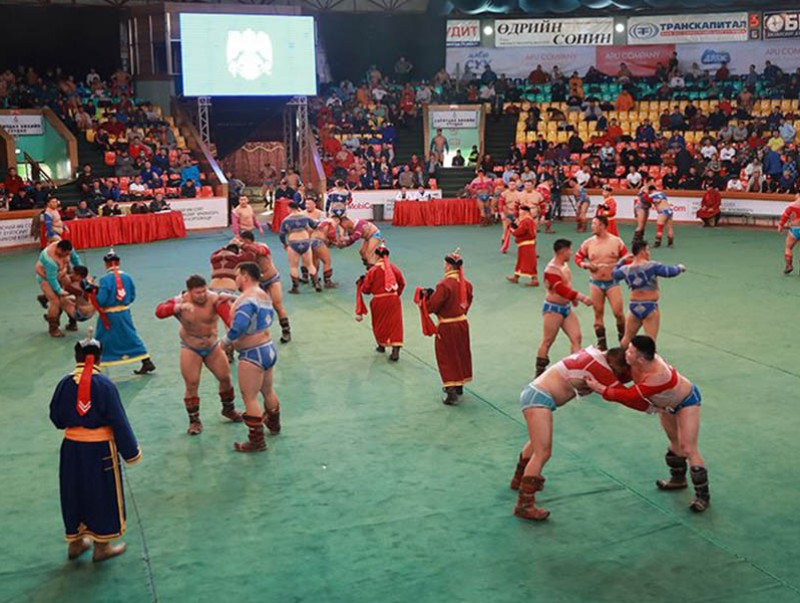 | Баянхонгор аймгийн золголтын барилдаанд зодоглох бөхчүүд | ||