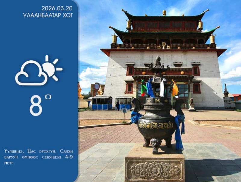 УЛААНБААТАР ХОТ ОРЧМООР: Үүлшинэ. Цас орохгүй. Салхи баруун өмнөөс секундэд 4-9 метр. 6-8 хэм дулаан байна.