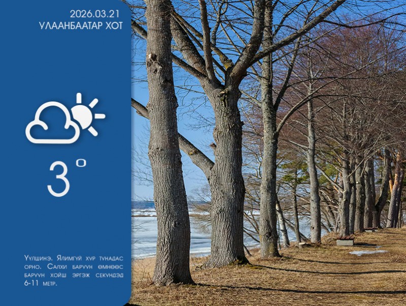 2026 оны 03-р сарын 21-ний 08 цагаас 20 цаг хүртэл: Нутгийн зүүн хагаст солигдмол үүлтэй, бусад нутгаар багавтар үүлтэй. Төвийн аймгуудын нутгийн зүүн, зүүн аймгуудын нутгийн хойд хэсгээр нойтон цас, цас орж, зөөлөн цасан шуурга шуурна. Нутгийн зүүн хагаст баруун өмнөөс баруун хойш эргэж, бусад нутгаар баруун хойноос секундэд 5-10 метр, говь, тал, хээрийн нутгаар секундэд 13-15 метр хүрч ширүүсэж, явган шуурга шуурна. Увс нуур болон Дархадын хотгор, Тэс голын хөндийгөөр 6-11 хэм хүйтэн, Хангай, Хөвсгөл, Хэнтийн уулархаг нутаг, Завхан, Заг-Байдраг голын эх, Идэр, Тэрэлж голын хөндийгөөр 1 хэмийн дулаанаас 4 хэм хүйтэн, говийн бүс нутгийн өмнөд хэсэг, цас багатай газар, Дарьгангын тал нутгаар 9-14 хэм, Их нууруудын хотгор, говийн бүс нутгийн хойд хэсгээр 4-9 хэм, бусад нутгаар 0-5 хэм дулаан байна.