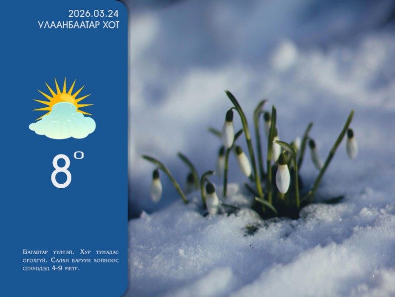 2026 оны гуравдугаар сарын 24-ний 08 цагаас 20 цаг хүртэл: Ихэнх нутгаар солигдмол үүлтэй. Монгол-Алтайн уулсаар хур тунадас орно. Бусад нутгаар хур тунадас орохгүй. Салхи нутгийн баруун хэсгээр баруун өмнөөс, бусад нутгаар баруун хойноос секундэд 4-9 метр, Алтайн салбар уулсаар секундэд 15-17 метр хүрч ширүүснэ. Увс нуур болон Дархадын хотгор, Завхан голын эх, Идэр,Тэс голын хөндийгөөр 2 хэмийн дулаанаас 3 хэм хүйтэн, говийн бүс нутгийн өмнөд хэсгээр 14-19 хэм, Их нууруудын хотгор, Орхон-Сэлэнгийн сав газар, говийн бүс нутгийн хойд хэсэг, Дарьгангын тал нутгаар 9-14 хэм, бусад нутгаар 3-8 хэм дулаан байна.