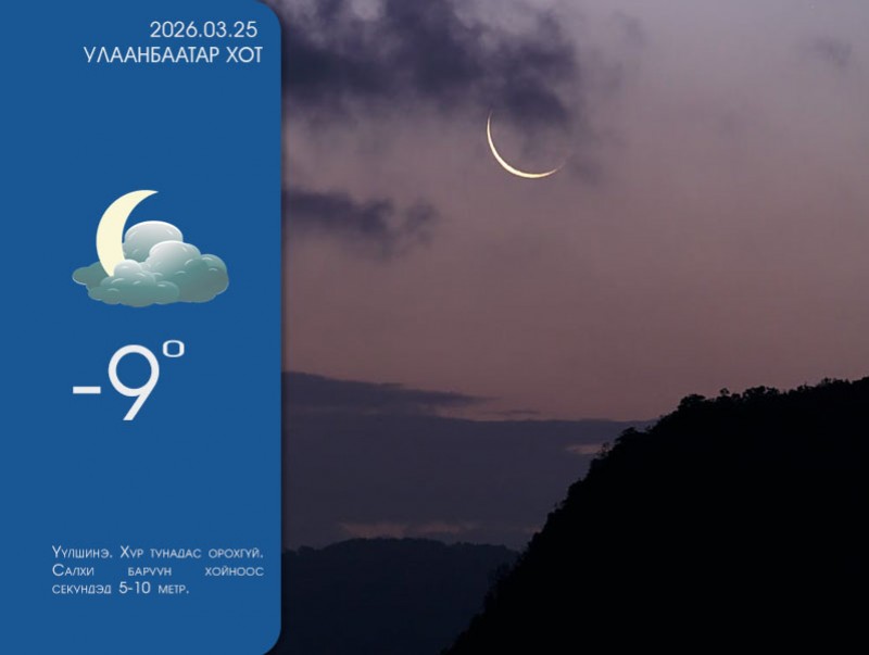 УЛААНБААТАР ХОТ ОРЧМООР: Шөнөдөө үүлшинэ. Өдөртөө үүл багасна. Хур тунадас орохгүй. Салхи шөнөдөө баруун хойноос, өдөртөө баруун өмнөөс секундэд 5-10 метр. Шөнөдөө Яармаг-Сонгины орчмоор 12-14 хэм, бусад хэсгээр 7-9 хэм хүйтэн, өдөртөө 7-9 хэм дулаан байна.