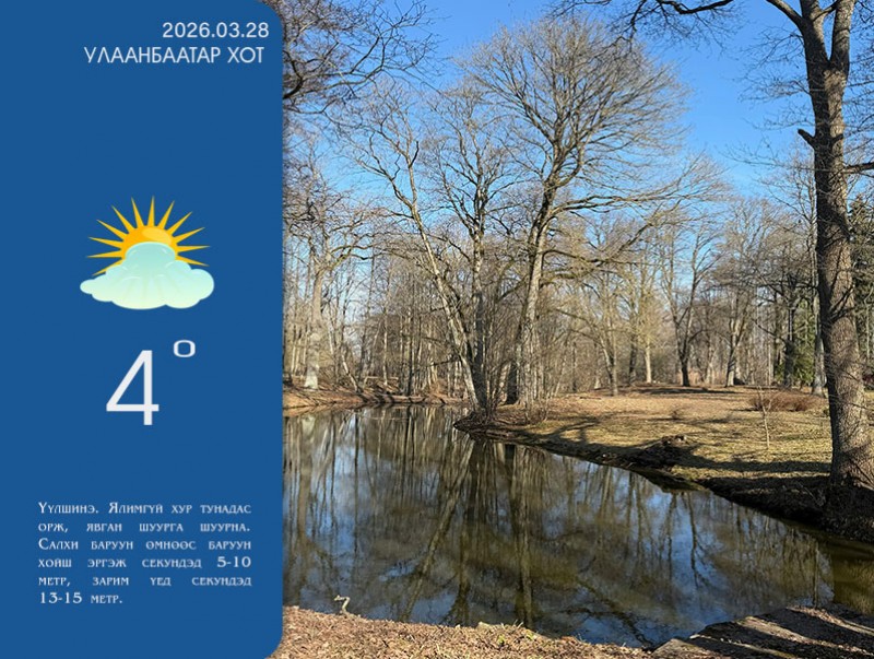 2026 оны 03-р сарын 28-ны 08 цагаас 20 цаг хүртэл: Ихэнх нутгаар үүлшинэ. Баруун аймгуудын нутгийн зүүн өмнөд хэсэг, төвийн аймгуудын нутгийн зарим газраар, говь болон зүүн аймгуудын нутгийн хойд хэсгээр хур тунадас орно. Нутгийн баруун хагаст баруун өмнөөс баруун хойш эргэж, бусад нутгаар баруун өмнөөс секундэд 5-10 метр, нутгийн зарим газраар секундэд 14-16 метр хүрч ширүүсэж, шороон шуурга шуурна.