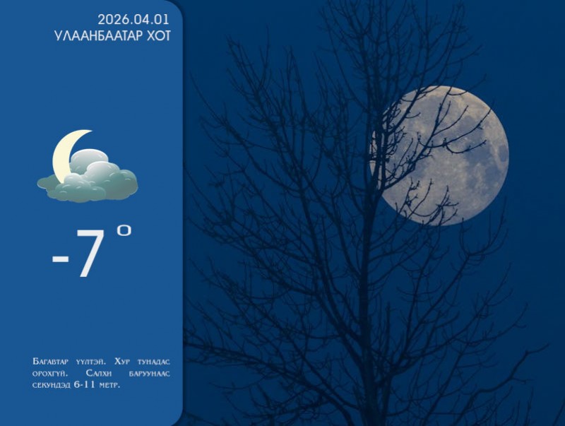 УЛААНБААТАР ХОТ ОРЧМООР: Багавтар үүлтэй. Хур тунадас орохгүй. Салхи баруунаас секундэд 6-11 метр. Шөнөдөө 5-7 хэм хүйтэн, өдөртөө 7-9 хэм дулаан байна.