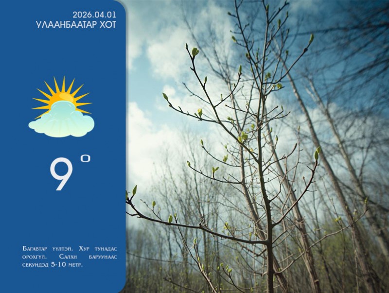 2026 оны дөрөвдүгээр сарын 01-ний 08 цагаас 20 цаг хүртэл: Ихэнх нутгаар солигдмол үүлтэй. Нийт нутгаар хур тунадас орохгүй. Салхи нутгийн баруун хагаст баруун өмнөөс, бусад нутгаар баруунаас секундэд 5-10 метр. Увс нуур болон Дархадын хотгор, Завхан голын эх, Хүрэнбэлчир орчим, Хэнтийн уулархаг нутаг, Тэс, Тэрэлж голын хөндийгөөр 2-7 хэм, Алтайн өвөр говиор 17-22 хэм, Их нууруудын хотгор, говийн бүс нутгийн өмнөд хэсгээр 13-18 хэм, бусад нутгаар 6-11 хэм дулаан байна.