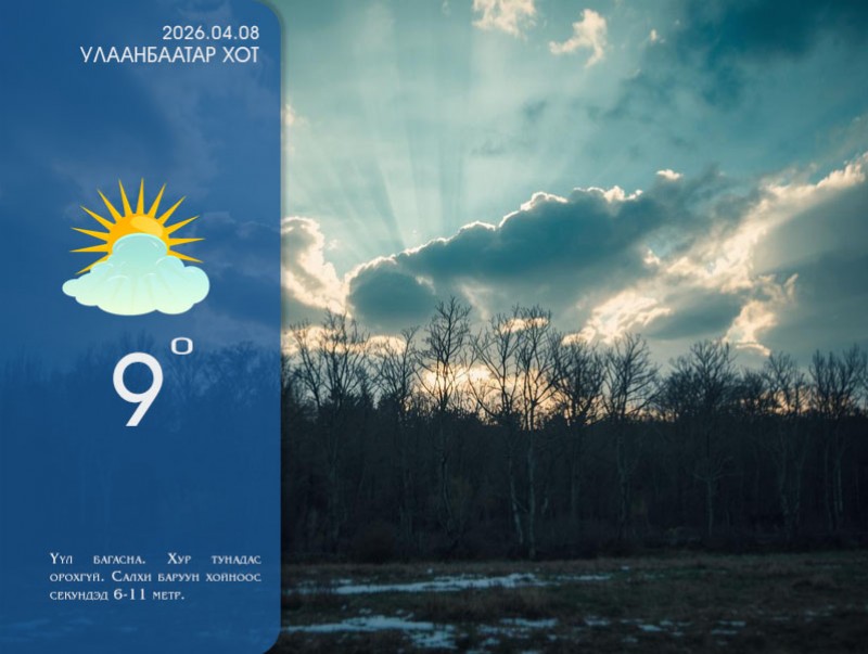 2026 оны дөрөвдүгээр сарын 08-ны 08 цагаас 20 цаг хүртэл: Ихэнх нутгаар үүлшинэ. Баруун аймгуудын нутгийн зүүн өмнөд, төвийн аймгуудын нутгийн баруун өмнөд, говийн аймгуудын нутгийн баруун хэсгээр бороо, нойтон цас орно. Бусад нутгаар хур тунадас орохгүй. Салхи говь болон зүүн аймгуудын нутгаар баруун өмнөөс баруун хойш эргэж, бусад нутгаар баруун хойноос секундэд 5-10 метр, нутгийн зарим газраар секундэд 12-14 метр хүрч ширүүсэж, шороон шуурга шуурна.