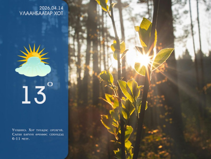2026 оны дөрөвдүгээр сарын 14-ний 08 цагаас 20 цаг хүртэл: Нутгийн хойд хэсгээр үүлшинэ. Бусад нутгаар солигдмол үүлтэй. Баруун аймгуудын нутгийн зарим газар, төвийн аймгуудын нутгийн баруун хэсгээр бороо, нойтон цас, цас орж, цасан шуурга шуурна. Бусад нутгаар хур тунадас орохгүй. Салхи нутгийн зүүн хагаст баруун өмнөөс, бусад нутгаар баруун өмнөөс баруун хойш эргэж секундэд 6-11 метр, Алтайн салбар уулс болон говь, тал, хээрийн нутгаар секундэд 18-20 метр хүрч ширүүсэж, шороон шуурга шуурна.