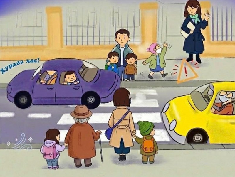 Хэдий яарч байсан ч зам хөндлөн гарахаар хүлээж буй явган зорчигчид зам тавьж өгөөрэй.