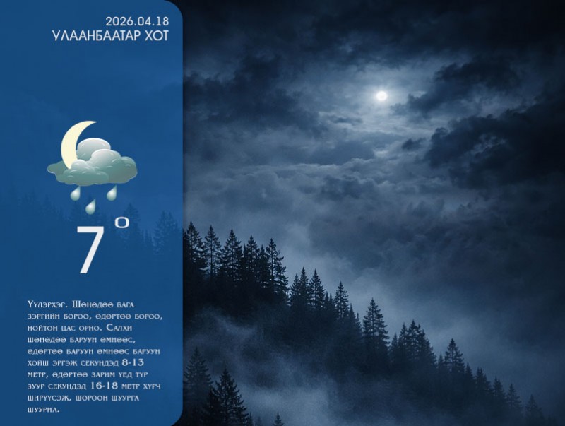 УЛААНБААТАР ХОТ ОРЧМООР: Үүлэрхэг. Шөнөдөө бага зэргийн бороо, өдөртөө бороо, нойтон цас орно. Салхи шөнөдөө баруун өмнөөс, өдөртөө баруун өмнөөс баруун хойш эргэж секундэд 8-13 метр, өдөртөө зарим үед түр зуур секундэд 16-18 метр хүрч ширүүсэж, шороон шуурга шуурна. Шөнөдөө 5-7 хэм, өдөртөө 16-18 хэм дулаан, үдээс хойшдоо эрс хүйтэрнэ.