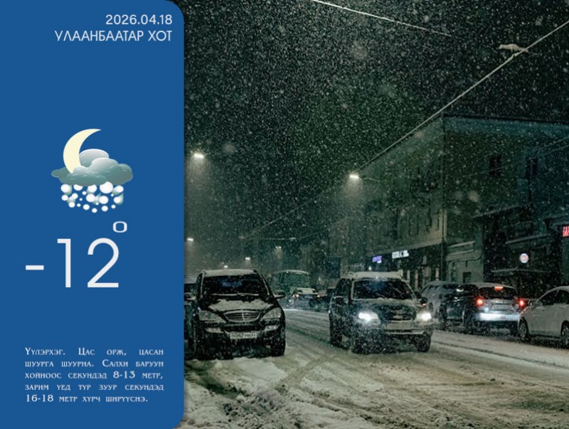 УЛААНБААТАР ХОТ ОРЧМООР: Шөнөдөө үүлэрхэг. Цас орж, цасан шуурга шуурна. Өдөртөө үүл багасаж, хур тунадас орохгүй. Салхи баруун хойноос секундэд 8-13 метр, зарим үед түр зуур секундэд 16-18 метр хүрч ширүүснэ. Өмнөх хоногоосоо 10-15 хэмээр эрс хүйтэрч, шөнөдөө 10-12 хэм, өдөртөө 0-2 хэм хүйтэн байна.