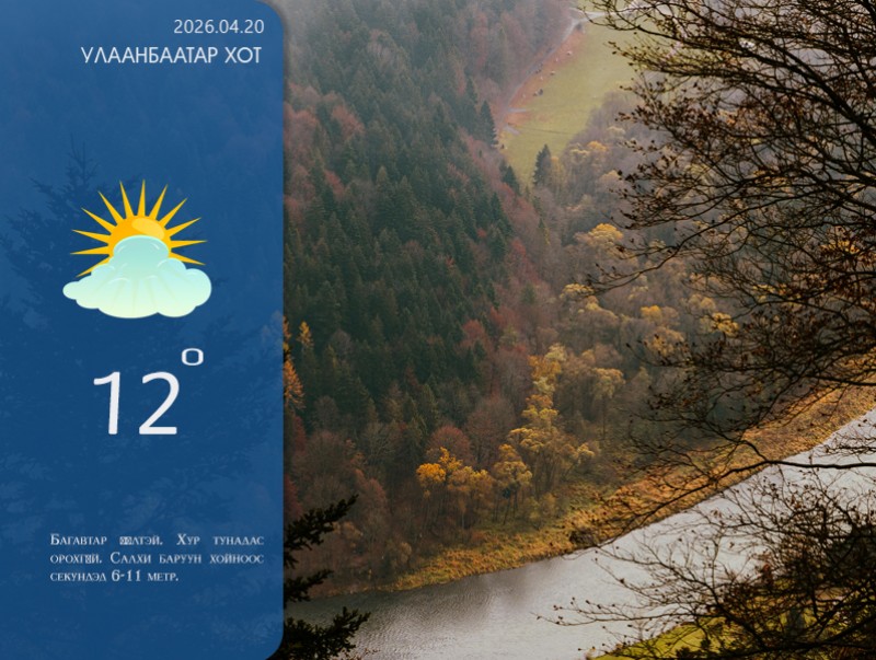 2026 оны дөрөвдүгээр сарын 20-ны 08 цагаас 20 цаг хүртэл: Нутгийн баруун хэсгээр солигдмол үүлтэй, бусад нутгаар багавтар үүлтэй. Халх голын сав газраар нойтон цас, цас орж, цасан шуурга шуурна. Бусад нутгаар хур тунадас орохгүй. Салхи ихэнх нутгаар баруун хойноос секундэд 6-11 метр, зүүн аймгуудын нутгаар түр зуур секундэд 16-18 метр хүрч ширүүсэж, шороон шуурга шуурна. Өдөртөө ихэнх нутгаар дулаарч Дархадын хотгор, Завхан голын эх, Хүрэнбэлчир орчим, Хэнтийн уулархаг нутаг, Тэс, Тэрэлж, Хэрлэн, Онон, Улз, Халх голын хөндий, Дорнод-Монголын тал нутгаар +4...+9 градус, Их нууруудын хотгор, говийн бүс нутгийн баруун өмнөд хэсгээр +13...+18 градус, бусад нутгаар +8...+13 градус дулаан байна.