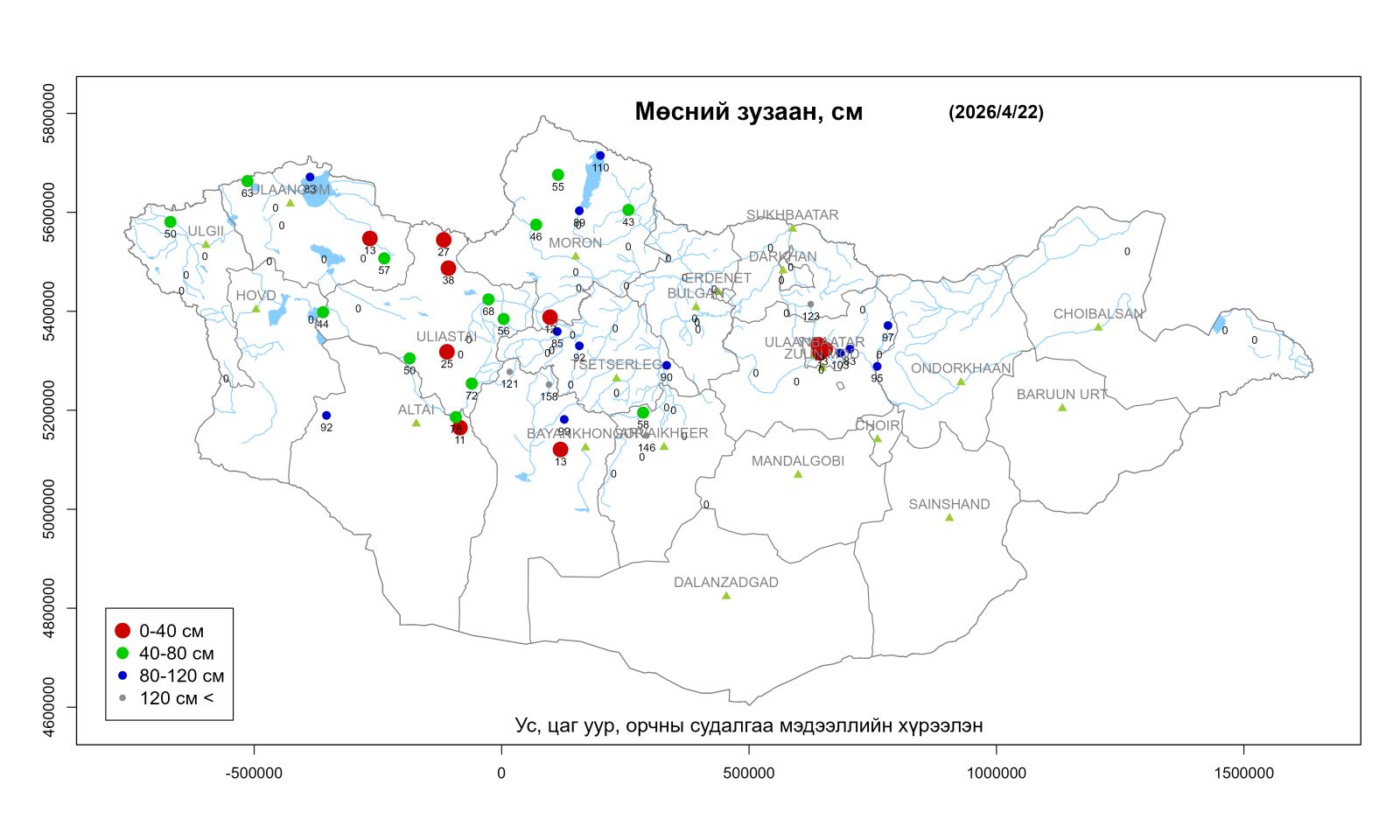 Дөрөвдүгээр сарын 22-ны өдрийн байдлаар манай орны зарим гол мөрөн, нуурууд битүү мөсөн бүрхүүлтэй хэвээр байгаа ч ихэнх голуудад цөн түрж гол мөснөөс бүрэн чөлөөлөгдсөн байна.