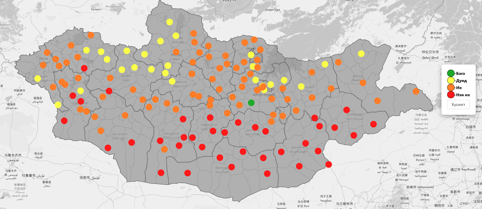 - Нэн их хуурайшилттай: Өмнөговь, Сүхбаатар, Дорноговийн нутаг, Увс, Ховд, Говь-Алтай, Баянхонгор, Өвөрхангай, Дундговийн өмнөд хэсгээр хуурайшилт нэн их байна.