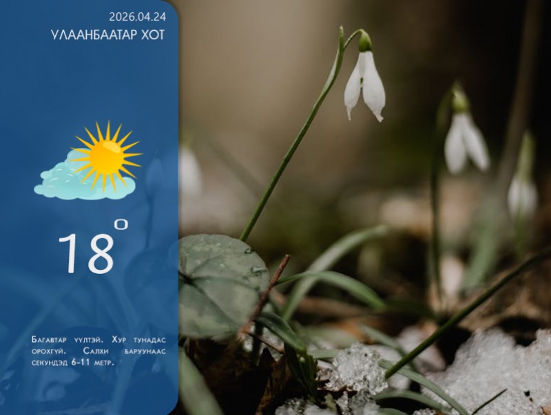2026 оны дөрөвдүгээр сарын 24-ний 08 цагаас 20 цаг хүртэл: Ихэнх нутгаар солигдмол үүлтэй. Монгол-Алтай, Хангай, Хөвсгөлийн уулархаг нутгаар ялимгүй хур тунадас орно. Бусад нутгаар хур тунадас орохгүй. Салхи нутгийн зүүн хэсгээр баруун хойноос, бусад нутгаар баруун өмнөөс секундэд 5-10 метр, тал хээрийн нутгаар секундэд 13-15 метр хүрч ширүүснэ. Монгол-Алтайн уулархаг нутаг, Онон, Улз, Халх голын хөндий, Дорнод-Дарьгангын тал нутгаар 7-12 хэм, Хангайн нурууны өвөр бэл, Эг, Үүр, Орхон голын сав газар, говийн бүс нутгаар 19-24 хэм, Алтайн өвөр говь, Эхийн голын Баянбүрд орчмоор 23-28 хэм, бусад нутгаар 13-18 хэм дулаан байна.