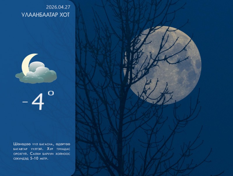 УЛААНБААТАР ХОТ ОРЧМООР: Шөнөдөө үүл багасна, өдөртөө багавтар үүлтэй. Хур тунадас орохгүй. Салхи баруун хойноос секундэд 5-10 метр. Шөнөдөө 2-4 хэм хүйтэн, өдөртөө 9-11 хэм дулаан байна.