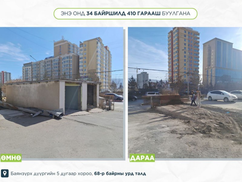 Харин “Гарааш” арга хэмжээний хүрээнд долоон дүүргийн нутаг дэвсгэрт 34 байршилд 410 гарааш буулгах юм. Өнөөдрийн байдлаар 14 байршилд 140 гарааш буулгаж, нийт 2520 ам метр талбайг чөлөөллөө. “Гарааш” арга хэмжээний хэрэгжилт 34.2 хувийн явцтай үргэлжилж байна. Хашаа, хайс, гарааш буулгаж чөлөөлсөн талбайг нийтийн эзэмшлийн зориулалтаар ашигладаг. Өнгөрсөн жилүүдэд чөлөөлсөн талбайд ногоон байгууламж, тоглоомын талбай, зогсоол зэрэг тохижилтыг хийж, мөн нийтийн эзэмшлийн гудамж, талбайг нэмэгдүүлэн ажиллаж байна.