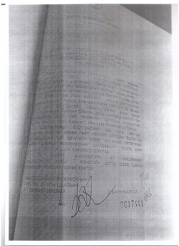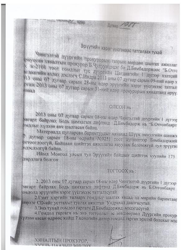 Тухайлбал, Сүхбаатар дүүргийн прокуророос гаргасан 2013 оны 12 сарын 13-ны өдрийн Б.Отгонбаярт эрүүгийн хэрэг үүсгэхээс татгалзах тухай гэсэн 4813 тоот тогтоол, Чингэлтэй дүүргийн шүүхээс Эрүүгийн хэрэг үүсгэхээс татгалзсан тухай 1788 тоот тогтоол, Нийслэлийн прокуророос 2014-12-18 нд гаргасан Эрүүгийн хэрэг үүсгэх үндэслэлгүй болох тухай 5/421 тоот тогтоол гэх мэт.