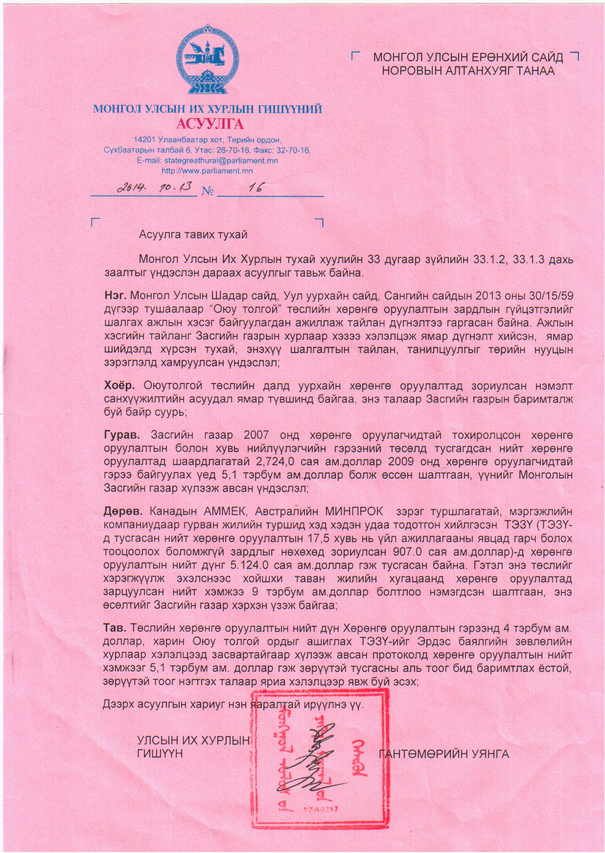 | Г.Уянга гишүүн Ерөнхий сайдад асуулга хүргүүлжээ | ||