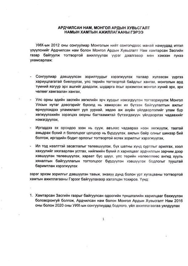 Ардчилсан намын дарга, Ерөнхий сайд Н.Алтанхуяг, МАХН-ын дарга Н.Энхбаяр нар өнгөрсөн долоо хоногт хамтран ажиллах гэрээнд гарын үсэг зурсан.