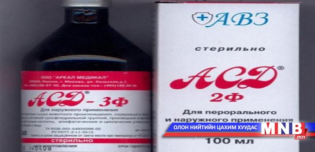 Малын өвчин анагаах зорилгоор үйлдвэрлэсэн АСД-3Ф, АСД-2Ф гэх эмүүдийг иргэд “Ходоод гэдэс, шархны бүх төрлийн өвчинд сайн байна” гэж ууж байгаа талаар өнөөдөр Мэргэжлийн хяналтын ерөнхий газраас мэдээллээ. Энэхүү эмийг хүн ууж болохгүй бөгөөд хэрэглэснээс хойш тодорхой хугацааны дараа хүний биед сөргөөр нөлөөлдөг байна.