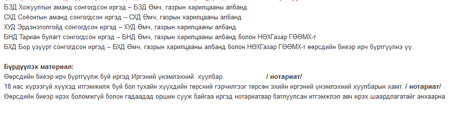 Гэр бүлийн зориулалтаар нийслэлийн 52 байршилд газар өмчлүүлэхээр болсон билээ. Одоогоор эхний таван байршлийг зарлаж, өмчлүүлээд байгаа бөгөөд хамгийн сүүлийн буюу тавдугаар ээлжинд газар өмчлөх эрхтэй болсон иргэдийн эрхийг энэ сарын 7-ны өдрийг хүртэл баталгаажуулна гэдгийг нийслэлийн өмчийн харилцааны газраас мэдээллээ. Хэдийгээр сугалаагаар газар өмчлөх эрх нь нээгдсэн ч өмчлөх эрхээ өөрийн биеэр очиж баталгаажуулахгүй бол тухайн эрх хүчингүй болох аж.  Өмчлөх эрх нь үүссэн ч баталгаажуулж амжаагүй байгаа  иргэд дараах байдлаар бүртгүүлж болох юм.