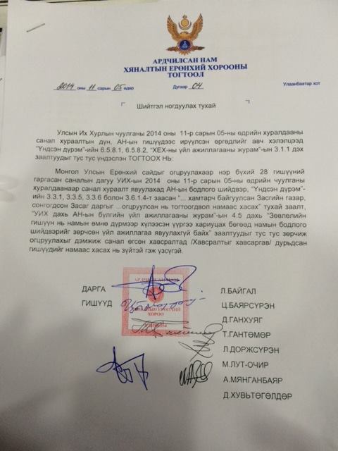 Түүнчлэн АН-ын Хяналтын Ерөнхий хорооноос гаргасан тогтоолыг тус хорооны дарга Л.Байгаль уншиж танилцуулсны дараа хурал даргалагч Э.Бат-Үүл Хяналтын Ерөнхий хорооноос гаргасан дээрх шийдвэр нь хууль бус гэдгийг хэлсэн байна. Өөрөөр хэлбэл намын дүрэмд зааснаар Хяналтын Ерөнхий хороо уг асуудлыг хамгийн хурдандаа гурав хоногийн дотор хэлэлцэж, тухайн хөөх гэж буй гишүүнд нь мэдэгдэх ёстой байдаг аж. Мөн Хяналтын хороо зөвхөн буруутай эсэх талаар тогтоол гаргах эрхтэй бөгөөд гишүүдийг намаас хөөх шийдвэр гаргах эрхгүй гэдгийг сануулжээ.
