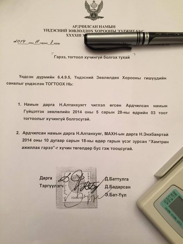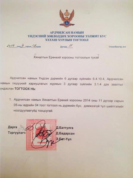 АН-ын даргын МАХН-тай байгуулсан гэрээг Н.Алтанхуяг хүчин төгөлдөр бус гэдгийг хэлж байсан байна. Гэвч Э.Бат-Үүл болон зарим гишүүд гэрээг хүчин төгөлдөр бус гэж байгаа хэдий ч УИХ-ын сонгуулиар МАХН нэгэнт гэрээ байгуулж гарын үсэг зурсан гээд шүүхэд хандах боломж байгаа учраас энэ асуудлаас сэргийлэх хэрэгтэй гэжээ. Өөрөөр хэлбэл, дээрх гэрээг хүчин төгөлдөр бус гэдгийг батлаж намын ҮЗХ-ны хуралдаанаас тогтоол гаргах хэрэгтэй гэсэн санал гаргасан аж. Үүний дагуу доорх тогтоолыг гаргажээ.