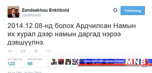 Гэтэл өнөөдөр УИХ-ын дарга, “Шонхор” фракцийн тэргүүн З.Энхболд өөрийн цахим хуудсаар дамжуулан ирэх сард болох намын Их хуралд өөрийгөө намын даргад нэр дэвшүүлнэ гэдгээ мэдэгдлээ.