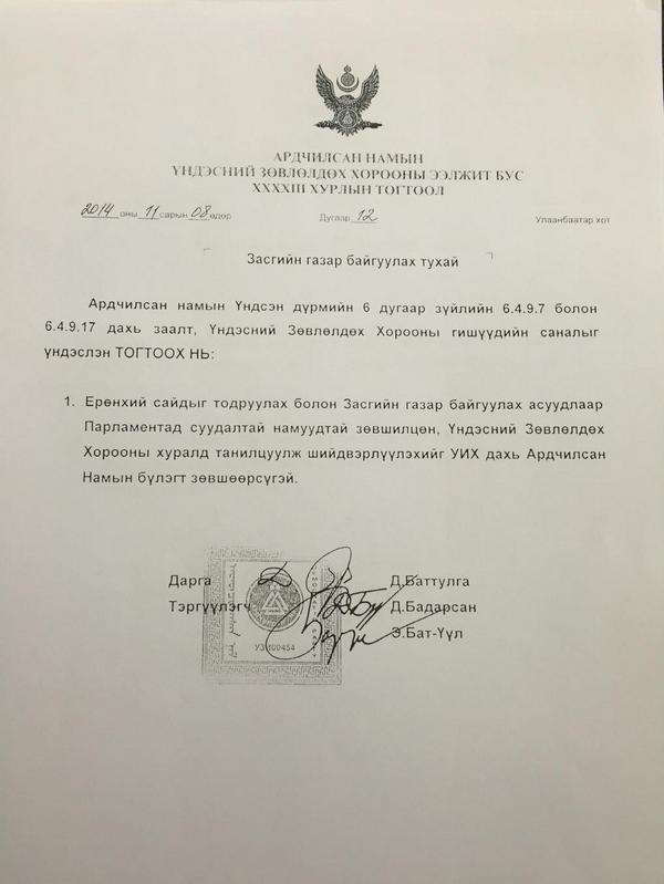 Саяхан хуралдсан Ардчилсан намын ҮЗХ-ын ээлжит бус чуулганаас шинэ хамтарсан Засгийн газар байгуулах болон Ерөнхий сайд томилох асуудлыг УИХ дахь АН-ын бүлэгт даалгасан тогтоол гаргасан хэмээн АН-ын бүлгээс мэдэгдэж тус тогтоолын хуулбарыг олон нийтэд танилцуулсан.