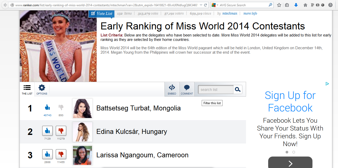 Азийн топ модель, Манжуурын мисс, Мисс Монголиа-2010 тэмцээний дэд байрын шагналт Т.Батцэцэг “Дэлхийн мисс-2014″ тэмцээнд эх орноо төлөөлөн оролцож байгаа билээ. Энэ жилийн тэмцээнд дэлхийн 131 орны гоо бүсгүйчүүд өрсөлдөж байгаа бөгөөд сайхан бүсгүйчүүдийн танилцуулга, зургийг www.ranker.com сайтад байрлуулж, санал хурааж байгаа. Өнөөдрийн байдлаар Т.Батцэцэг онлайн санал хураалтыг тэргүүлж байгаа бөгөөд түүний хойноос Унгар, Камерун улсын миссүүд жагсаж байна.