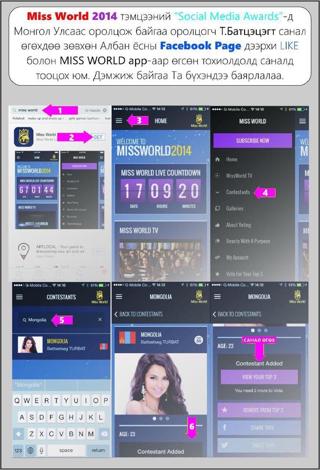 Дэлхийн сайхан бүсгүйг шалгаруулах "Miss world 2014" тэмцээн Лондон хотноо зохион байгуулагдаж байна. Тус тэмцээнд Монгол Улсыг төлөөлөн Төрбатын Батцэцэг оролцож байгаа юм. Тэрбээр 130 орны миссүүдээс шилдэг 20-т шалгараад байгаа билээ. Харин одоо тун удахгүй хэдхэн цагийн дараа интернет санал хураалт дуусах гэж байна. Манай мисс санал хураалтын дүнгээр Хайти, Непал улсуудын ард гуравдугаарт бичигдэж байгаа юм.