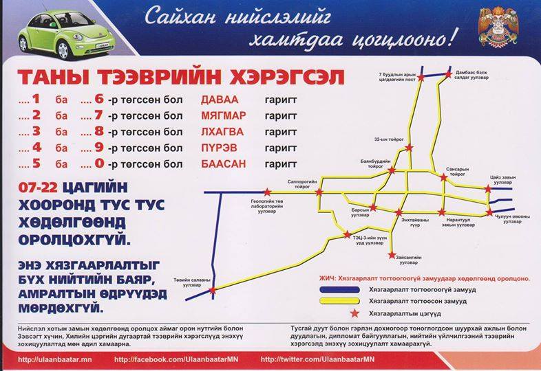 Харин энэ талаар нийслэлийн ЗДТГ-ын мэргэжилтэн “Зарим мэдээллийн хэрэгслээр 2012 онд батласан “Авто машины дугаарыг долоо хоногийн өдрөөр ялган дугаарын хязгаарлалтад оруулах” тогтоолыг “хугацаа дууссан” гэх мэтээр худал мэдээлэл их цацагдаж байна. Энэ тогтоолд анхнаасаа тодорхой хугацаа заагаагүй. Хэдий хүртэл хэрэгжүүлнэ, хэрэгжсээр л байх болно. Харин ирэх даваа гарагт хуралдах хуралдаанаар 07:00-22:00 байсныг 08:00-21:00 цаг болгох, зарим нэг замыг хязгаарлалтад нэмэх, хасах асуудлыг ярилцана” гэв.