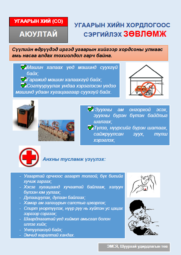 Сүүлийн өдрүүдэд иргэд угаарын хийгээр хордсоны улмаас амь насаа алдах тохиолдол гарч байгаа тул иргэдэд дараах сэрэмжлүүлгийг хүргэж байна.