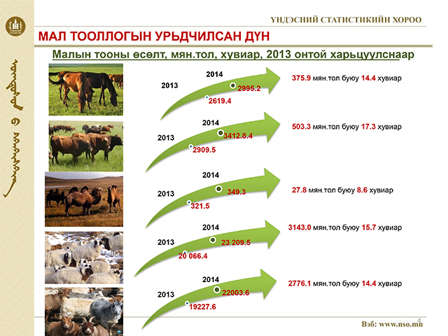 Мал тооллогын урьдчилсан дүнгээр 2014 оны жилийн эцэст манай улсын мал сүргийн нийт дүн 51.9 сая толгойд хүрч, 2013 оныхоос 15.1 хувь буюу 6.8 саяар өслөө. Урьдчилсан дүнгээр адуун сүргийн тоо толгой 2.9 сая, үхэр 3.4 сая, тэмээ 349.3 мянга, хонь 23.2 сая, ямаа 22.0 саяд хүрч, 2013 оныхоос адуу 375.9 мянга, үхэр 503.3 мянга, тэмээ 27.8 мянга, хонь 3.1 сая, ямаа 2.8 сая толгойгоор өсчээ.
