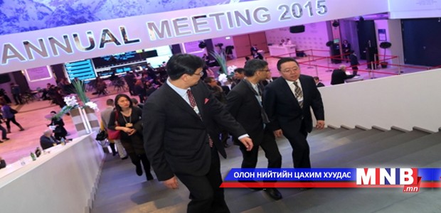 Энэ удаагийн чуулганд Монгол Улсын Ерөнхийлөгч Ц.Элбэгдоржийг дагалдан Гадаад хэргийн сайд Л.Пүрэвсүрэн болон албаны хүмүүс,хэвлэл мэдээллийн бүрэлдэхүүн оролцож байна. Монгол Улс тус чуулга уулзалтад өндөр ач холбогдол өгч оролцож ирсэн. Дэлхийн болон бүсийн чуулга уулзалтад оролцохын зэрэгцээ Улаанбаатар хотноо 2010,2011,2014 онд “Хариуцлагатай уул уурхайг хөгжүүлэх нь” сэдэвт дугуй шиээний уулзалт 2011,2014 онд”Авлигын эсрэг түншлэл” салбар хуралдаан” “Монгол орны усны хангамжийн асуудлыг шийдвэрлэх нь” “Монгол Улсын усны нөөц-хөгжлийн хурдасгуур” сэдэвт хэлэлцүүлгийг амжилттай зохион байгуулсан. Монгол Улс Дэлхийн эдийн засгийн чуулга уулзалтаас санаачилсан Авлигын эсрэг түншлэлийн санаачилгад нэгдэн, Авлигын эсрэг түншлэлийн Монголын сүлжээг байгуулсан. Өнгөрсөн онд гадаад хэргийн яам Дэлхийн эдийн засгийн чуулга уулзалттай хамтран ажиллах Харилцан ойлголцлын санамж бичиг байгуулж, манай улсын хөгжлийн чиг хандлага, хэтийн төлөвийг тодорхойлсон судалгааны төслийн хүрээнд “Монгол Улсын хөгжлийн ирээдүйн асуудлаарх стратегийн яриа хэлэлцээ” сэдэвт дугуй ширээний уулзалтыг Улаанбаатар хотноо зохион байгуулсан.