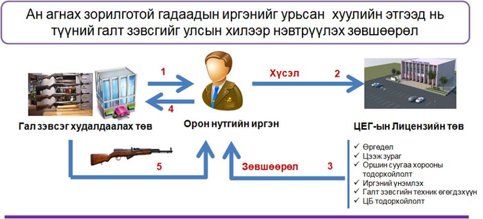 Монгол Улсын Галт зэвсгийн тухай хуулийн 5,1, 5,2 дахь заалтад заасан шаардлага хангасан нийслэлийн иргэнд галт зэвсэг худалдан авах зөвшөөрлийг Нийслэлийн цагдаагийн газраас, хөдөө орон нутгийн иргэнд ЦЕГ-ын Лицензийн төвөөс олгоно.