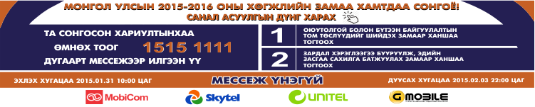 Монгол Улсын Ерөнхий сайд Ч.Сайханбилэг МҮОНТ-ийн “Цаг үе-үзэл бодол” нэвтрүүлэгт оролцлоо. Дэлгэрэнгүй мэдээллийг ЭНДЭЭС уншина уу. Ерөнхий сайд тус нэвтрүүлэгт оролцохдоо “Монгол Улсын 2015-2016 оны хөгжлийн замаа хамтдаа сонгоё” нэрийн дор иргэд олон нийтээс мессежээр санал авах болсноо зарласан. Санал авах ажилд хяналт тавих ажлын хэсгийг байгуулаад байна. Хяналтын ажлын хэсэг нь харилцаа холбооны үйлчилгээ эрхлэгч компаниудаар дамжуулан өгөх саналын үйл ажиллагаанд 2015 оны нэгдүгээр сарын 31-нээс буюу өнөөдрөөс хоёрдугаар сарын гуравны өдрүүдэд хяналт тавьж, ажлын тайланг саналын дүнгийн хамт хоёрдугаар сарын 4-ний өдөрт багтаан Засгийн газрын Хэрэг эрхлэх газарт хүргүүлэх юм. Үүрэн холбооны сүлжээ эрхлэгчид иргэдийн саналыг 15151111 тусгай дугаараар хүлээн авахын тулд санал асуулгын тестийг өөрийн сүлжээн дэх бүх хэрэглэгчдэд мессежээр илгээнэ.