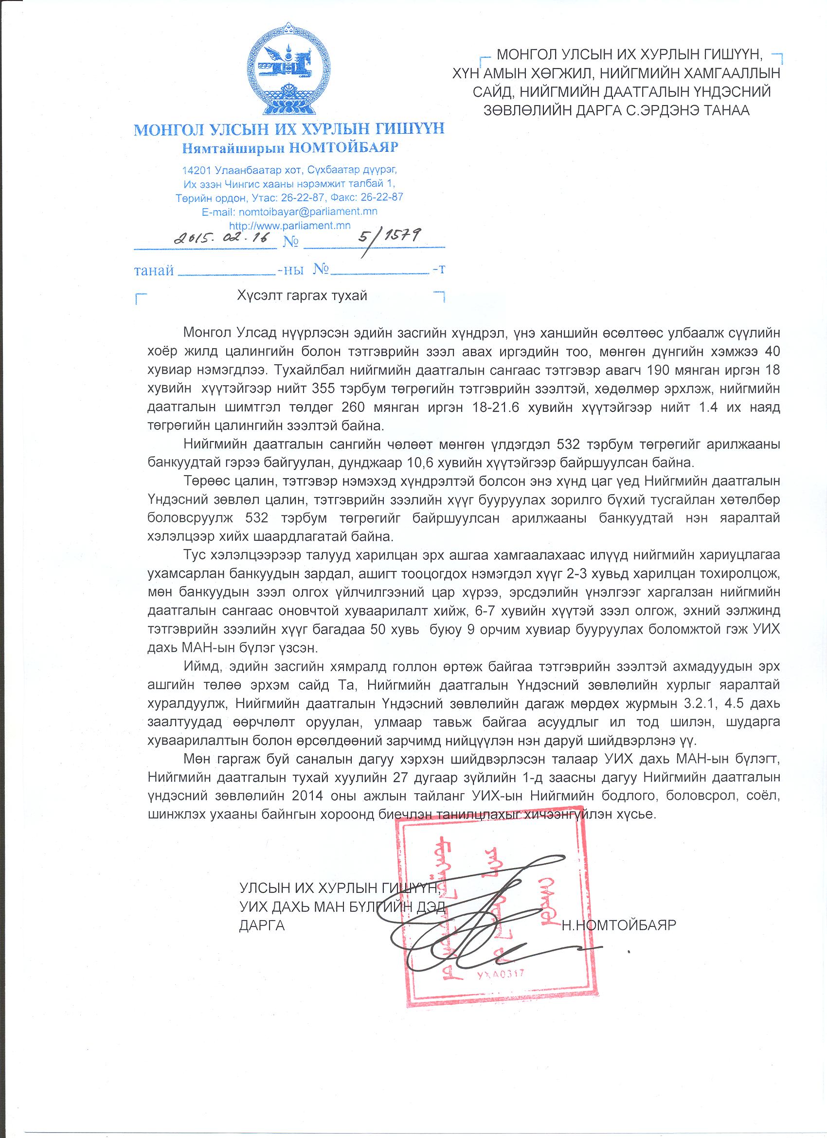УИХ дахь МАН-ын бүлгийн дэд дарга Н.Номтойбаяр Хүн амын хөгжил, нийгмийн хамгааллын сайд, Нийгмийн даатгалын үндэсний зөвлөл/НДҮЗ/-ийн дарга С.Эрдэнэд Нийгмийн даатгалын үндэсний зөвлөлийг яаралтай хуралдуулах хүсэлт тавилаа. Тэрбээр эдийн засгийн хямралд голлон өртөж байгаа тэтгэврийн зээлтэй ахмадуудын эрх ашгийн төлөө Нийгмийн даатгалын үндэсний зөвлөлийг яаралтай хуралдуулж, МАН-ын бүлгээс тавьж байгаа тэтгэврийн зээлийн хүүг бууруулах асуудлыг ил тод, шударга хуваарилалтын болон өрсөлдөөний зарчимд нийцүүлэн нэн даруй шийдвэрлэхийг сайдаас хүсчээ.